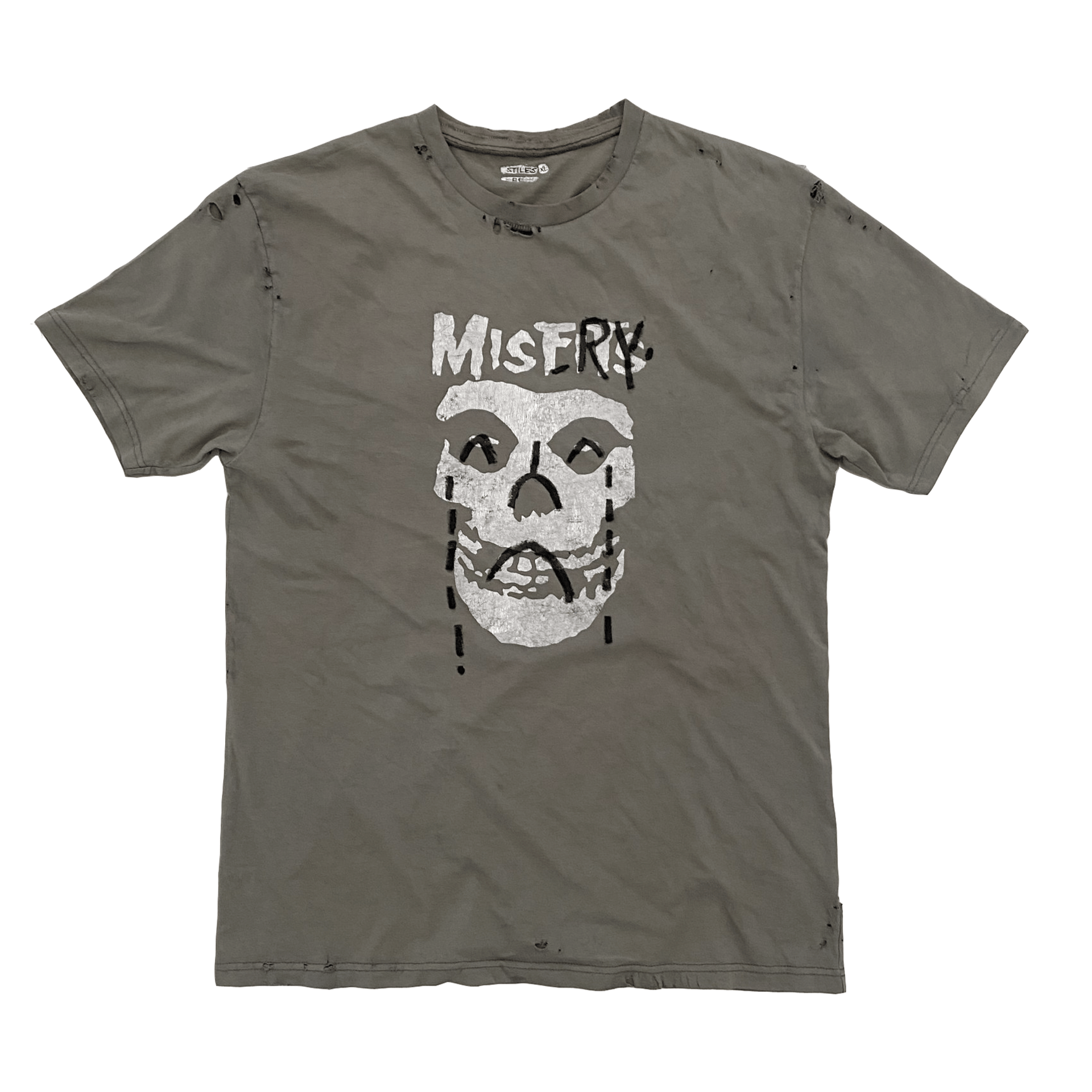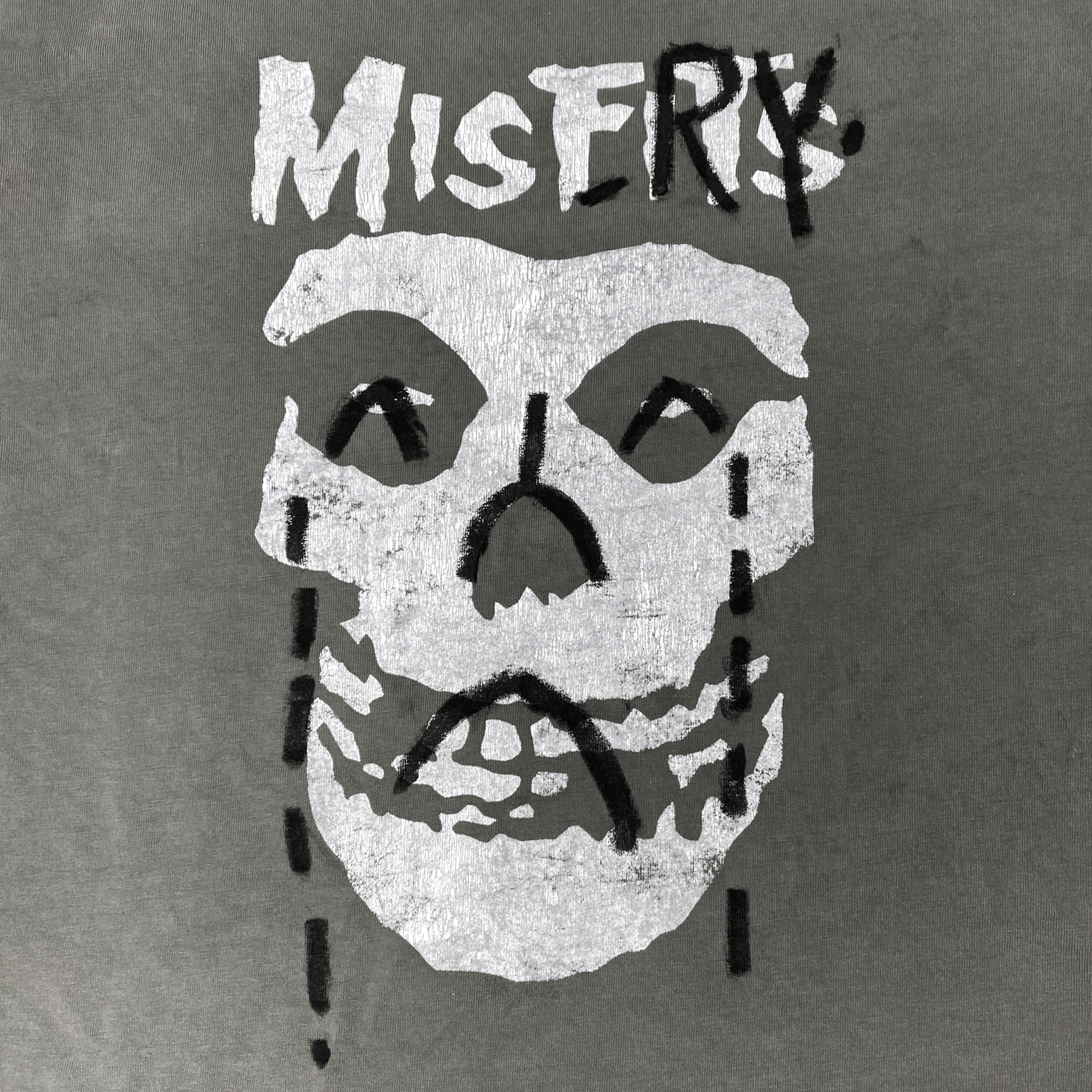 By changing one word, the garment moves from band iconography into emotional territory. “Misery” reframes the skull — no longer just a symbol of rebellion, but something more internal, more human. It becomes about condition rather than culture.