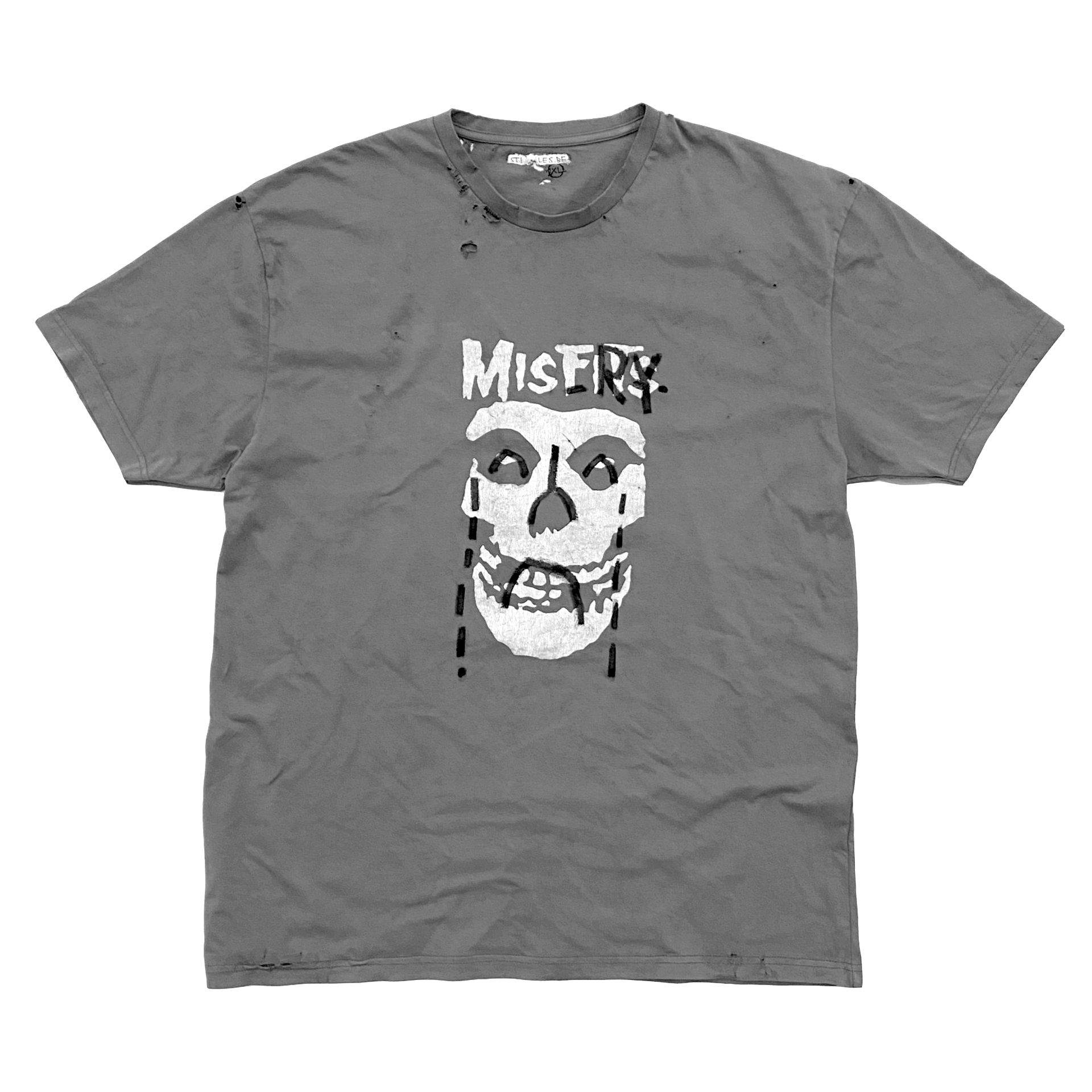Sourced from bootleg Misfits tees, each shirt is individually hand-distressed,, faded, and marked directly with drawing interventions. The process is deliberately physical and irreversible — tearing, staining, and reworking the fabric until the garment transcends merchandise and becomes artwork.