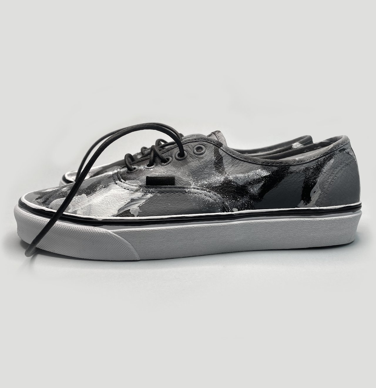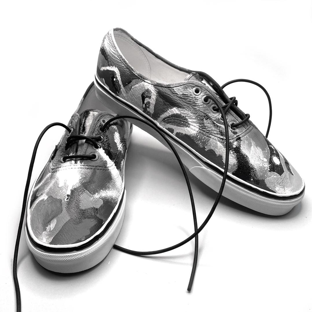 Each pair begins as a blank slate: a clean white leather Vans® Authentic. Through a process of expressive layering — using Angelus leather paints, MTN spray paint, and Sakura solidified paint marker — the surface is treated as a canvas for spontaneous gesture and meditative mark-making. The resulting composition is raw, intuitive, and unrepeatable.