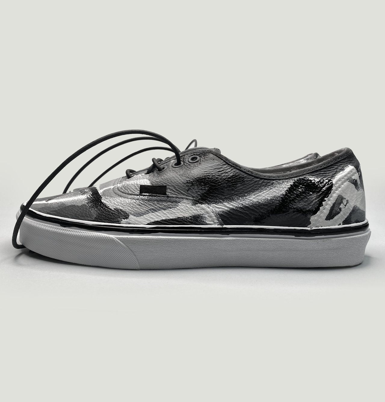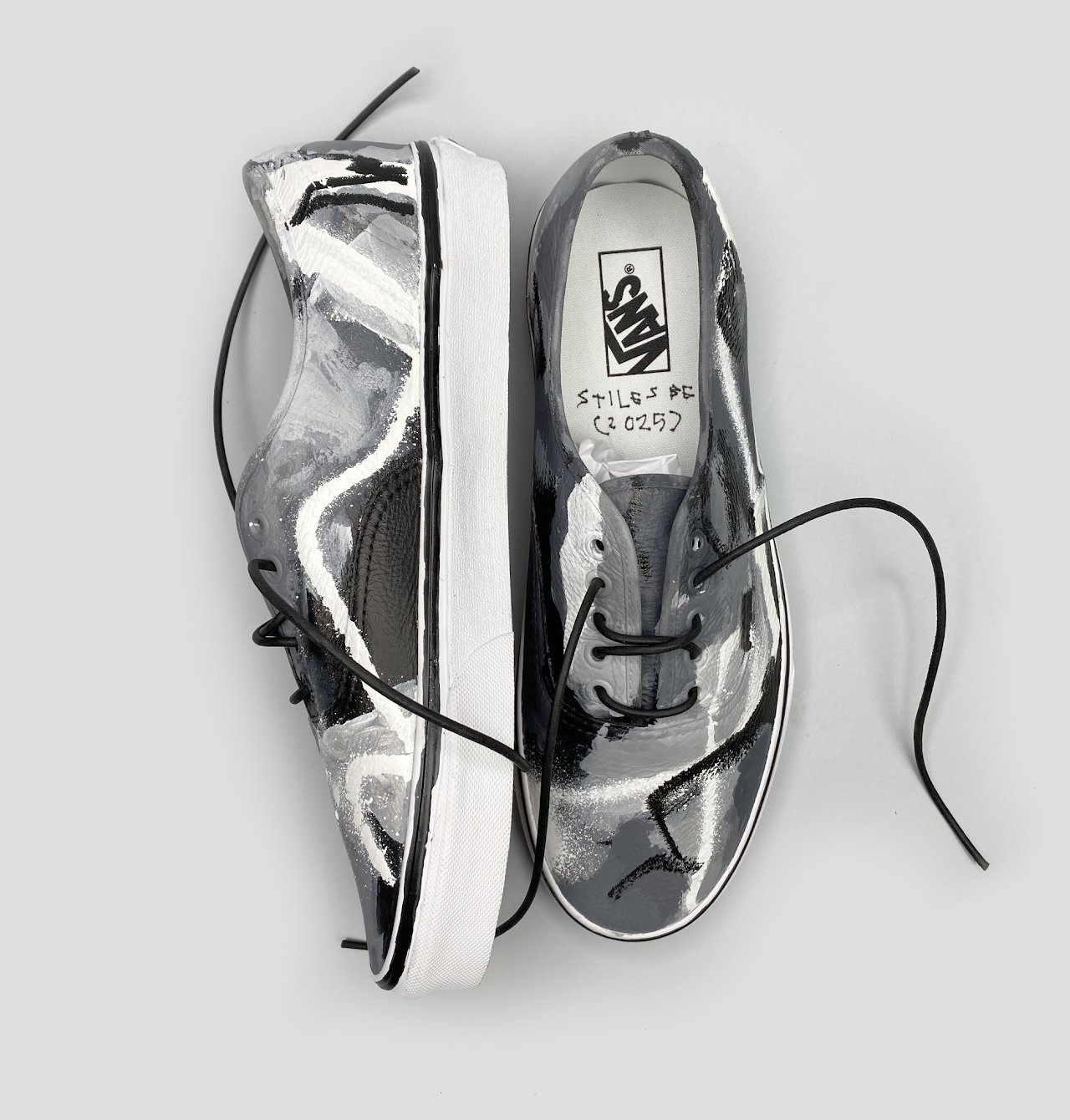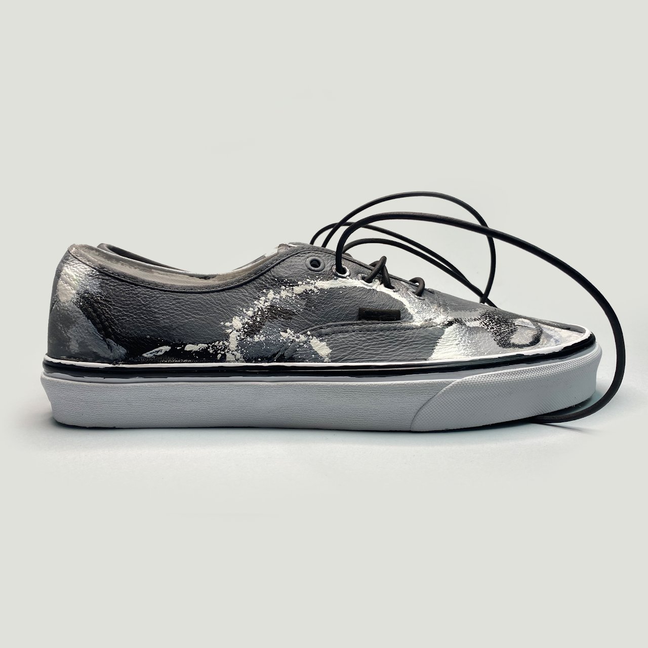 Each pair begins as a blank slate: a clean white leather Vans® Authentic. Through a process of expressive layering — using Angelus leather paints, MTN spray paint, and Sakura solidified paint marker — the surface is treated as a canvas for spontaneous gesture and meditative mark-making. The resulting composition is raw, intuitive, and unrepeatable.